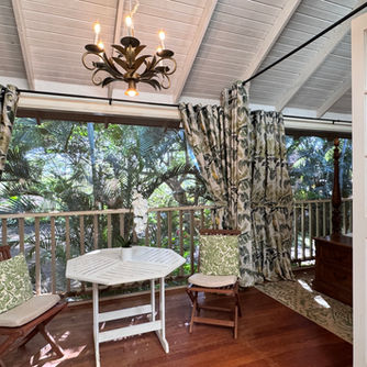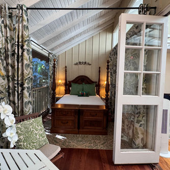 French doors open up to the charming outdoor lanai, which offers a spacious and inviting area for guests. The sleeping porch is private and lined with beautiful draperies, creating a cozy and exotic bedroom. Wake up to the soothing sounds of birdsong & enjoy your morning coffee in your pajamas!